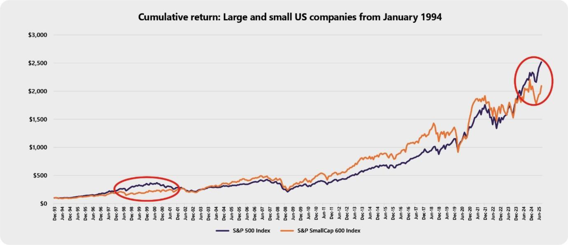 To provide some context around this, the chart below shows the cumulative return of two different US share indexes going back to the beginning of 1994 – the S&P 500 (Large cap index, in purple) and the S&P SmallCap 600 (Small cap index, in orange)1.